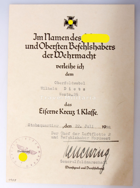 Urkunde Eisernes Kreuz 1. Klasse Dietz Westa. 26